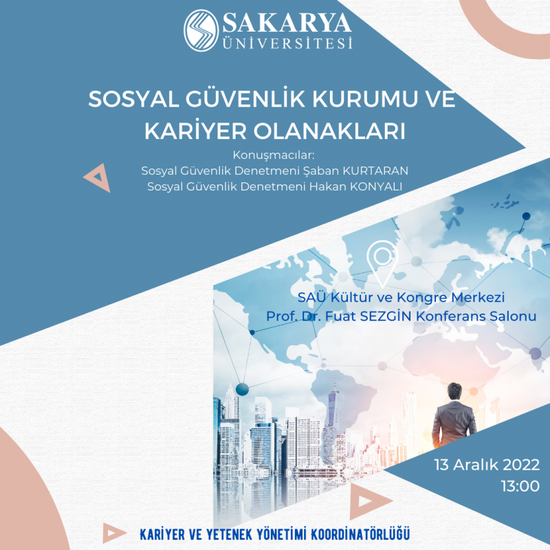 Kariyer ve Yetenek Yönetimi Koordinatörlüğü tarafından düzenlenen ''Sosyal Güvenlik Kurumu ve Kariyer Olanakları" adlı eğitim 13 Kasım 2022 Salı günü saat 13.00'te SAÜ Kültür ve Kongre Merkezi Prof. Dr. Fuat SEZGİN Salonu'nda gerçekleşecektir.