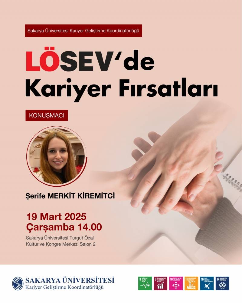 19 Mart 2025 Çarşamba günü saat 14.00'te SAÜ Lösev Topluluğu iş birliği ile düzenlediğimiz Lösev'de Kariyer Fırsatları adlı etkinliğimize hepinizi bekliyoruz. Turgut Özal Kültür ve Kongre Merkezi Prof. Dr. Fuat Sezgin Salonu 19 Mart 2025 14.00