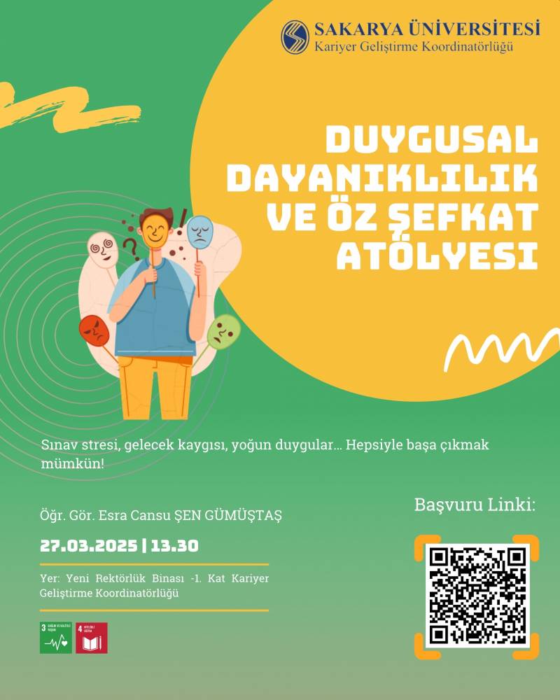 Duygusal Dayanıklılık ve Öz Şefkat Atölyemizde stresli durumlarla başa çıkma, duygusal zorlukları aşma ve kendimize karşı nazik olma yollarını keşfedeceğiz. Bu çalışma, hem kişisel gelişiminizi desteklemek hem de zorlayıcı anlarda kendinizi daha güçlü hissetmenizi sağlamak amacıyla hazırlanmıştır. Sizleri aramızda görmekten memnun olacağız.