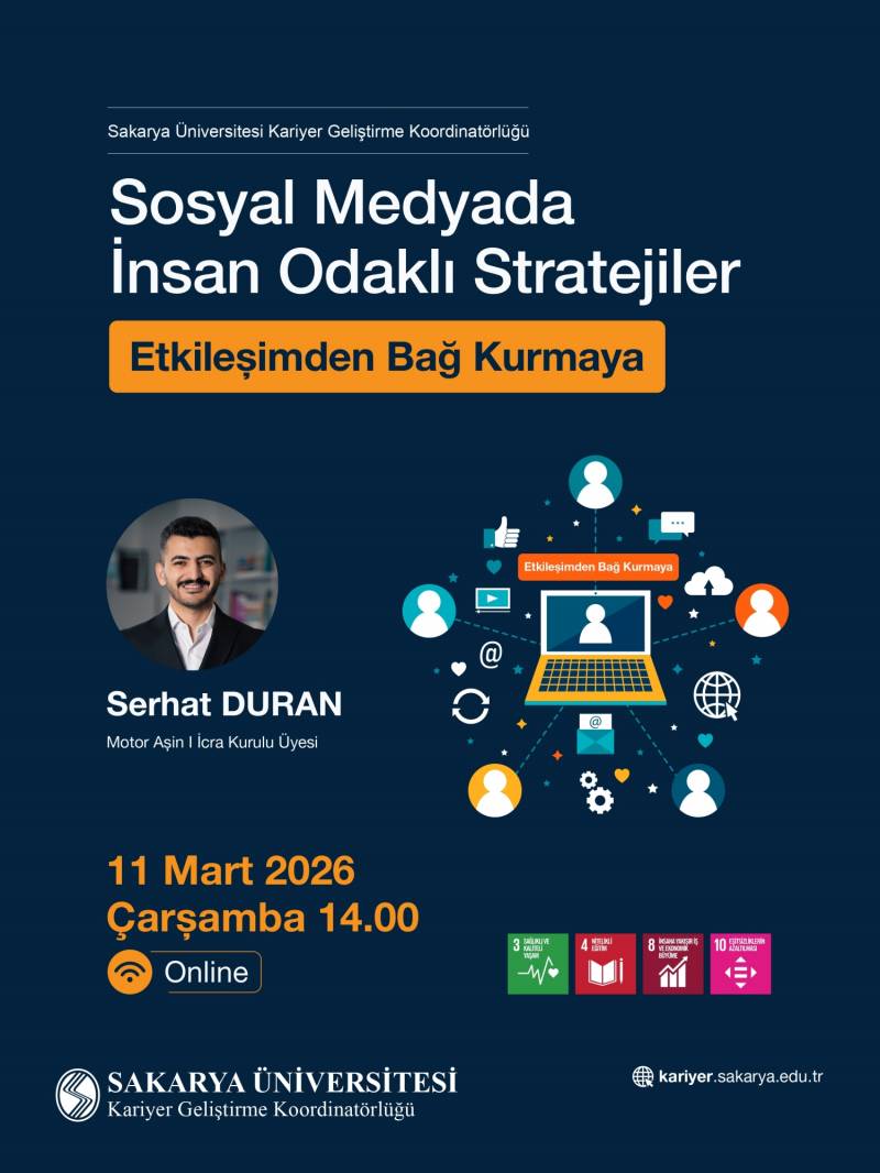 Sakarya Üniversitesi Kariyer Geliştirme Koordinatörlüğü olarak Motor Aşin İcra Kurulu Üyesi Serhat DURAN’ı ağırlıyoruz. Sosyal medyanın teknik detaylarından sıyrılıp "Etkileşimden Bağ Kurmaya" uzanan o kritik yolculuğa birlikte çıkacağız.